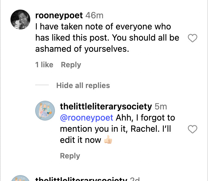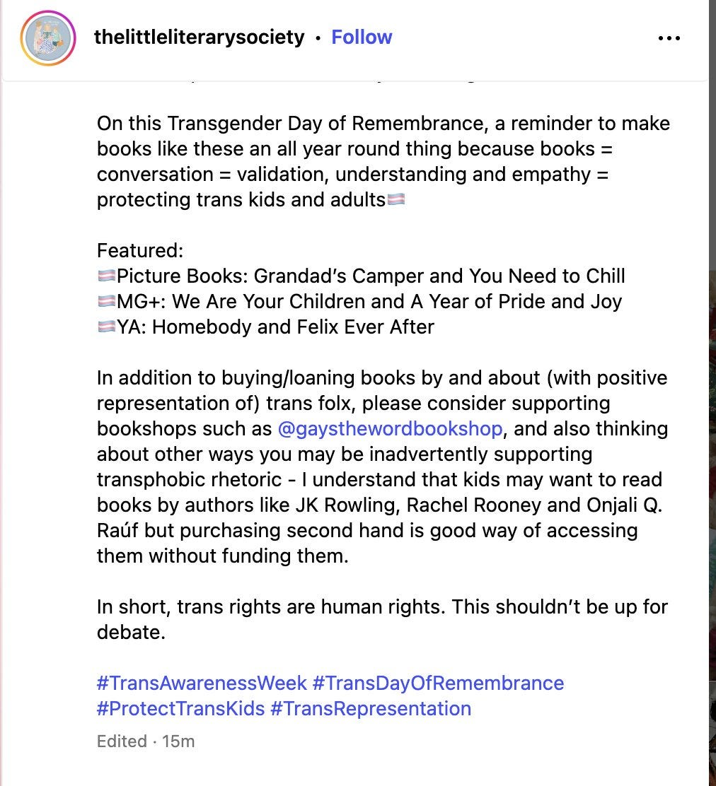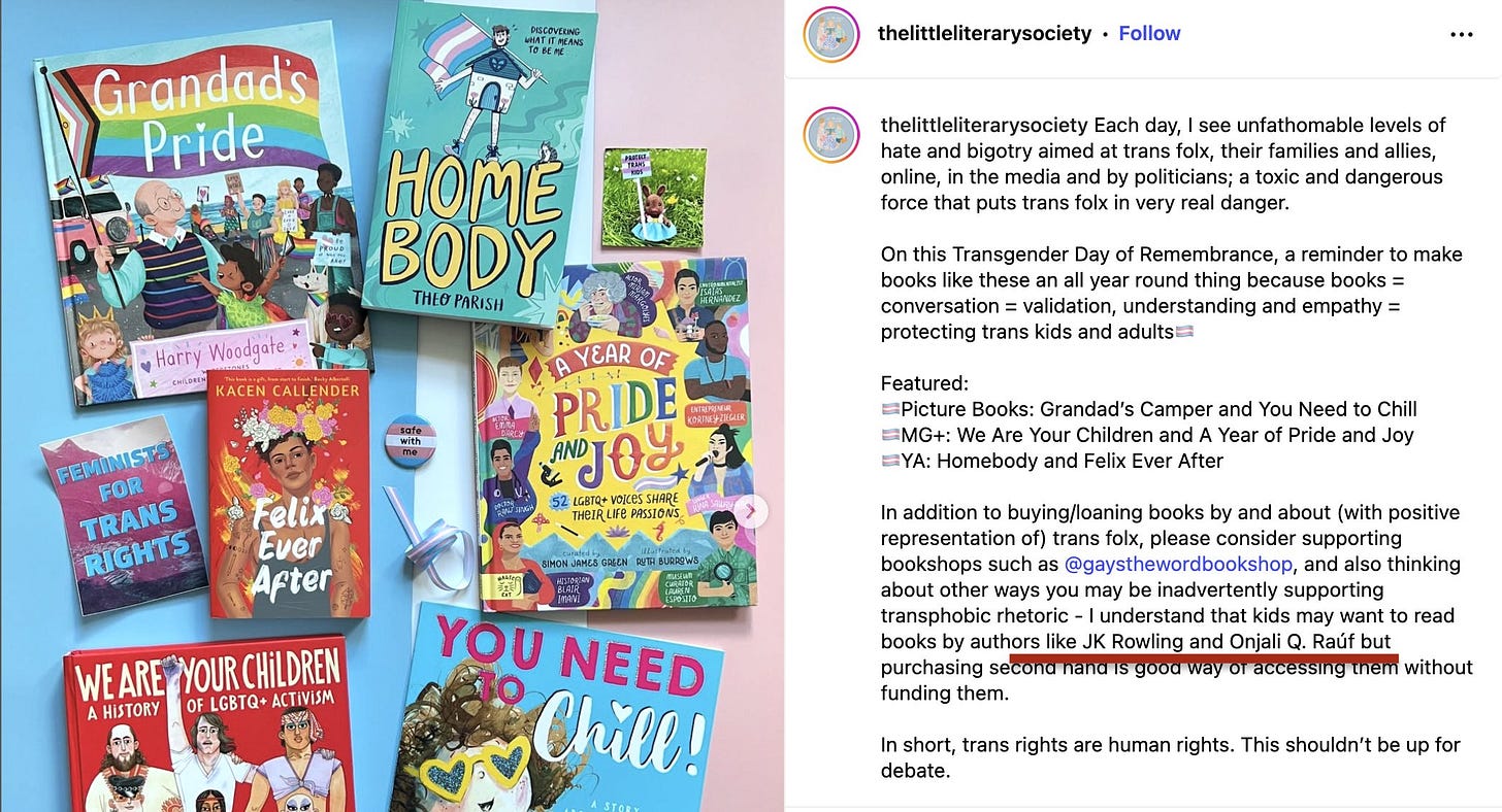 We were horrified to learn The Little Literary Society, an independent online bookstore specialising in children’s books which sells through Bookstore.org, posted on Instagram last week, urging its followers to boycott the books by Onjali Raúf and JK Rowling. We were further horrified when Rachel Rooney was added to this boycott list for daring to remonstrate.